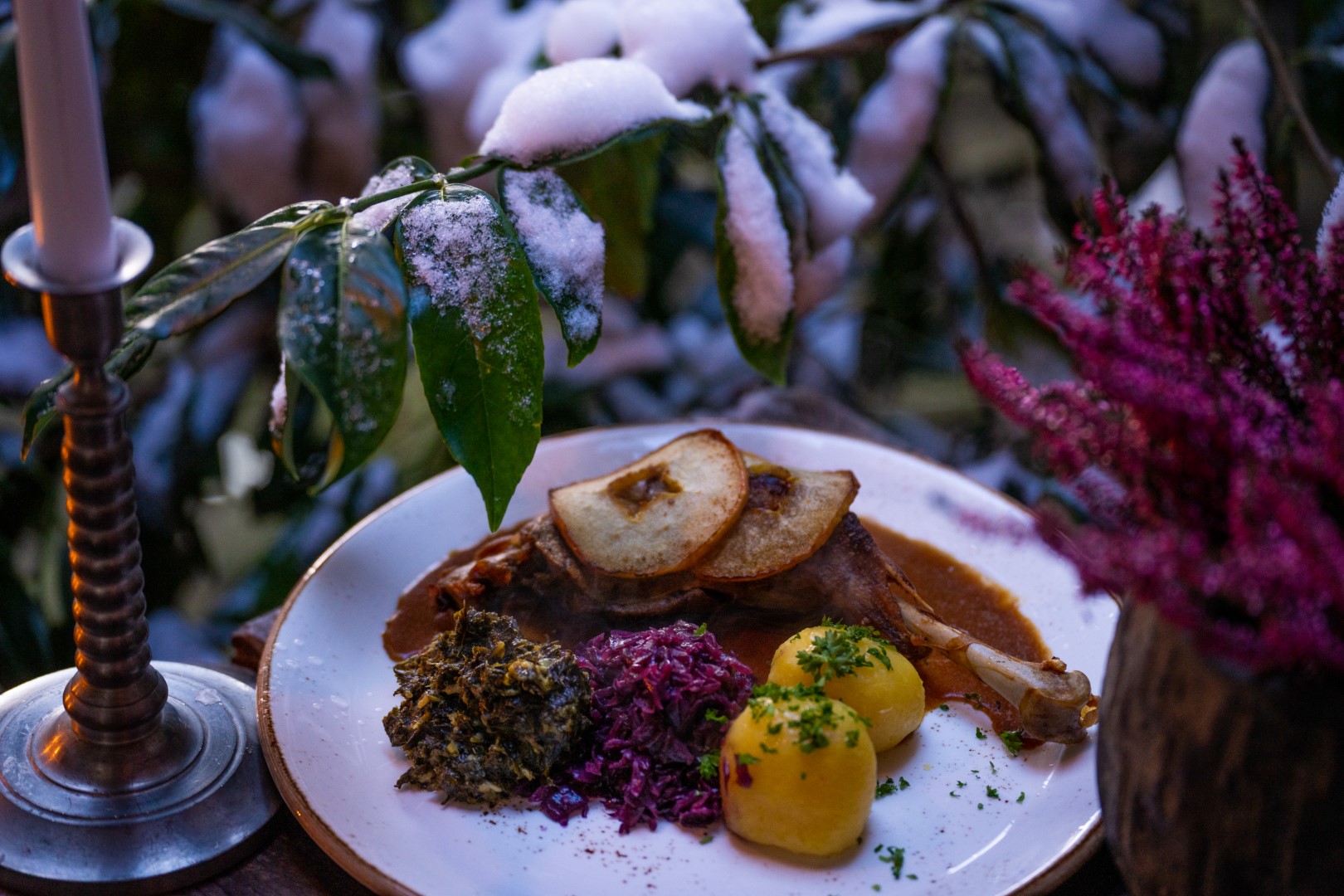 … saftigem Entenbraten aus dem Backofen, ofenfrischer Schweinshaxe, geräuchertem Kassler, Fjordlachsfilet im Gewürzsud pochiert, Beifußsoße, Kräutersoße, Schwarzbiersoße, Sauerkraut, Apfelrotkohl, Schlossgemüse und Semmelknödel zum Hauptgang!
